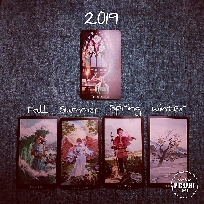 "Seasons"photo by the author using Witches Tarot deck by Ellen Dugan and Mark Evans copyright 1996 used with permissions on Llewellyn publishing